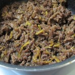 生姜と牛肉を入れたら汁気が無くなるまで中火で焦がさないように炒り煮する。