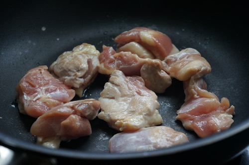 鶏肉を皮目からフライパンで焼き、両面を焼いたら1の夕顔を加えます。
