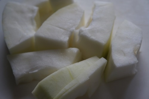 夕顔は輪切りにしたあと、皮を厚めに剥いて中の種部分も切り落とします。