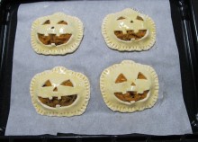 溶き卵を薄く塗ってかぼちゃ餡をのせ、上面のパイ生地をかぶせて縁をフォークなどで押さえて生地を閉じる。