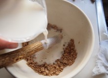 牛乳に 溶かした固形黒砂糖を加える