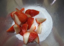 ボウルに白玉粉・フロストシュガー・四等分にカットした苺を入れて、耳たぶくらいの柔らかさになるように捏ねる。