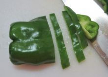 ピーマンは洗ってヘタと種を取って半分に切り、横に5mm位の細切りにする。