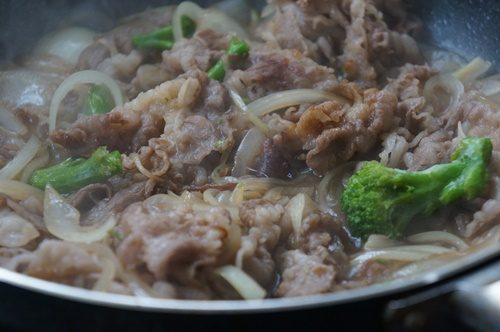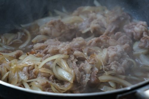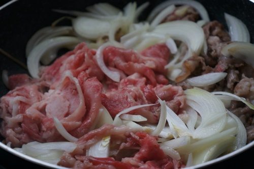 玉ねぎは繊維に沿って切るといいです。お水を加えて玉ねぎが柔らかくなるまで加熱することで、おいしい牛丼になります。