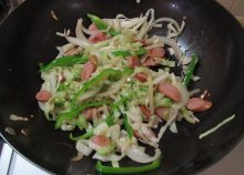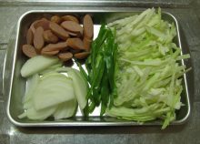 野菜を5mm幅にカットし、ウインナーは薄切りにする。 - 2.
