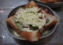 卵液のボウルに4の具を入れて混ぜ、2の食パンに盛ったら、とろけるチーズをのせる。
