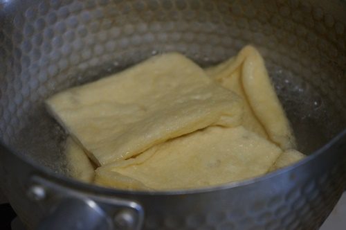 2つに切った油揚げを、熱湯の中に30秒ほど入れます。