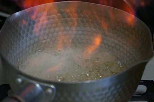 鍋にお酒とみりんを加えて火にかけ、沸騰してきたら鍋をほんの少し傾けて