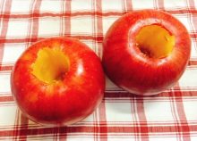 りんごを洗い、芯を底1/4残してくり抜きます。芯抜きがなければ、果物ナイフとスプーンで少しずつ芯を取ります。