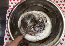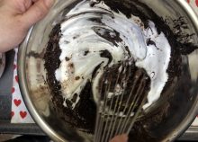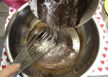 卵黄とチョコレートのボウルにふるっておいた薄力粉とココアを加え、泡立て器でゆっくり混ぜます。