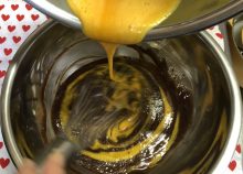 卵黄にグラニュ糖を加え、泡立て器で少し白くもったりするくらい泡立て、溶かしたバターとチョコレートに加え、泡立て器で混ぜます。 - 2.