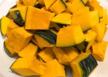 かぼちゃの種とワタを取り、皮の部分は傷などは取り除きます。3cmくらいの大きさに切って耐熱皿に入れ、ラップをし電子レンジで3~5分程柔らかくなるまで加熱します。