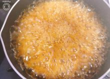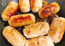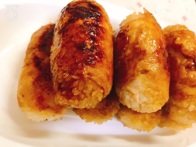 作ったタレを肉巻きおにぎりに回し入れ、からめながら焼きます。
