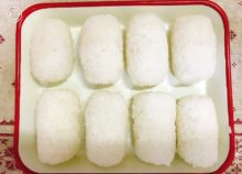 ご飯をラップで俵型ににぎります。