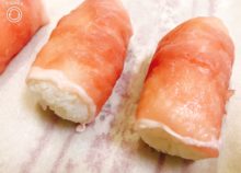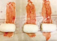 しゃぶしゃぶ用など薄切りの豚肉を俵型にしたおにぎりに巻いて