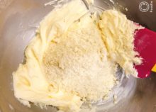 アーモンドパウダーを入れ、さらにすり混ぜます。