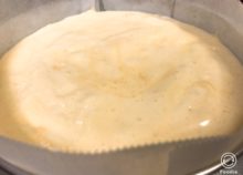 用意しておいた型に生地を流し入れ、台の上に数回平らに落として大きな泡を消します。