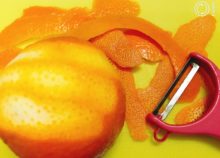 オレンジを洗い、皮をピーラーで細長くむきます。