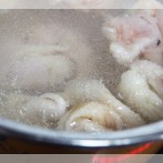 鶏皮は沸騰したお湯にくぐらせ、火が通ったら氷水で冷やし