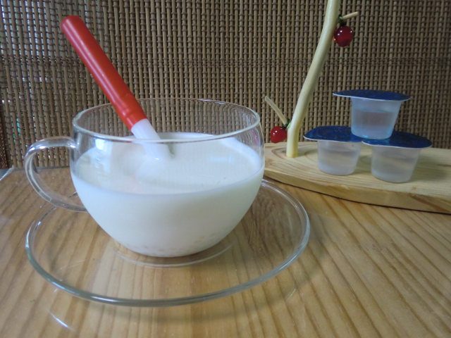 次女がジュースを飲みたがるので(長女はまったく欲しがらなかったから驚いているー)、なにかこっそり飲める物を作ってみようと考えた末、見た目牛乳なのでラッシーにしました。