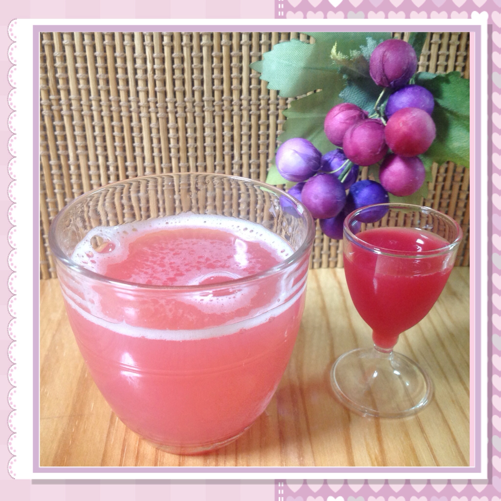 色々な作り方があると思うのですが、作るときのぶどうの量・糖度・好みの甘さがありますので、今回はまず100%ジュースを作り、出来上がった物にガムシロップで甘さを調節する方法をとりました。