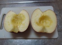 行程2で、りんごの底をくりぬき過ぎないように少しずつ削って下さい。