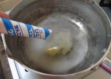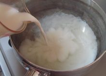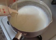 粉寒天が溶けたら、牛乳を入れて一煮立ちする。 - 4.