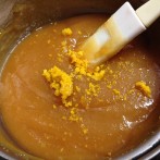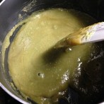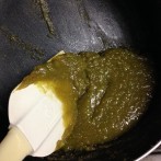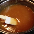 鍋肌に付いた味噌を取りながらしっかりと艶が出るまで練り合わせます。練り合わせながら味見をして、甘みが足りないようならば